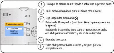 | NOTA: | el disparador automático se desactiva al tomar la fotografía, grabar el vídeo o apagar la cámara. |