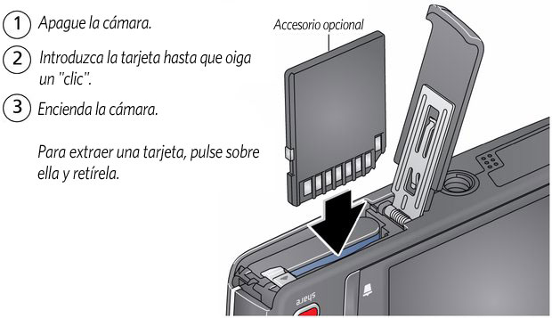 PRECAUCIÓN: Las tarjetas sólo se pueden colocar de una forma; si las fuerza, podría dañarlas. Si inserta o retira una tarjeta mientras la cámara está encendida, podría dañar las fotografías, la tarjeta o la cámara. |