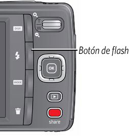 Pulse el botón del flash varias veces hasta que la pantalla LCD muestre el modo de flash deseado. Los modos de flash son diferentes según el modo de captura.