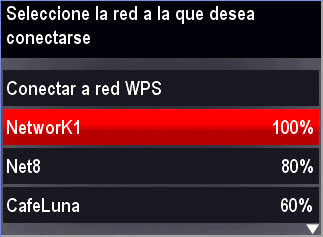 El LED de conectividad Wi-Fi parpadea mientras la impresora busca las redes inalámbricas disponibles dentro del alcance, luego muestra la lista en orden de potencia de señal. Por ejemplo: