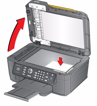 Levante la tapa del escáner y coloque el documento o la imagen con la cara que desea copiar hacia abajo en el ángulo frontal derecho.