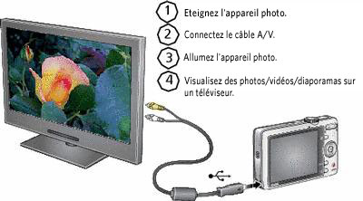 Vous pouvez afficher des photos, des vidéos ou des diaporamas sur un téléviseur, un écran d'ordinateur ou tout autre périphérique équipé d'une sortie vidéo. Pour connecter l'appareil photo à un téléviseur, utilisez un câble A/V (audio/vidéo) – peut être vendu séparément –, puis reportez-vous aux sections Visualisation de photos/vidéos ou Visualisation d'un diaporama.