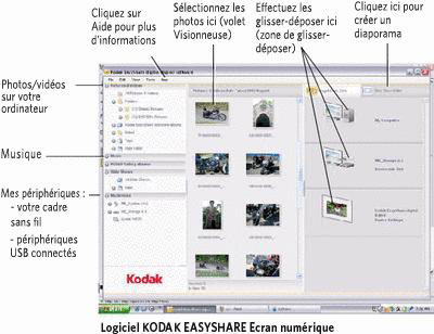 Le logiciel KODAK EASYSHARE Ecran numérique (inclus dans le CD fourni avec votre cadre) vous permet de glisser-déposer (copier) des photos, vidéos et musique entre votre cadre et votre ordinateur ou appareils connectés (Connexion d'un appareil photo numérique ou d'un autre périphérique USB) à l'aide d'une connexion sans fil.