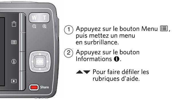 Votre appareil photo intègre un système d'aide. Les réglages de chaque menu y sont décrits.