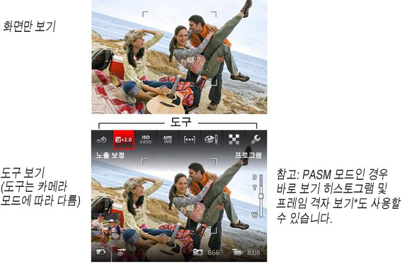 사용 가능한 모든 기능을 보고 싶을 때도 있고, 이러한 기능 표시 없이 화면만 보고 싶을 때도 있습니다. 디스플레이 버튼 을 눌러 화면만 보기와 도구 보기 간을 전환합니다.