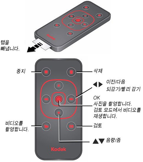 선택 사양 리모콘을 사용하여 녹화를 시작/중지하거나 비디오 및 사진을 검토할 수 있습니다. www.kodak.com/go/accessories를 참조하십시오.