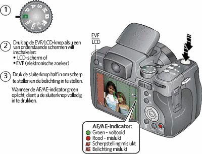 | OPMERKING: | Nadat u een foto hebt gemaakt, wordt deze gedurende 5 seconden als quickview op het EVF/LCD-scherm weergegeven. De foto wordt opgeslagen, tenzij u op de Delete-knop (Verwijderen) drukt. |