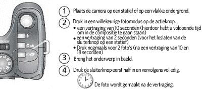 Druk op de actieknop om de zelfontspanner te annuleren voordat de foto wordt gemaakt. (De instelling voor de zelfontspanner blijft actief.)