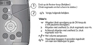 Druk op de Review-knop (Bekijken) als u uw foto's en video's wilt bekijken of bewerken.