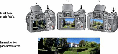 | OPMERKING: | U krijgt de beste resultaten als u een statief gebruikt. (Raadpleeg De zelfontspanner gebruiken voor het loslaten van de sluiterknop op een statief.) Alleen de panoramafoto wordt bewaard. Afzonderlijke foto's worden niet bewaard. Het fotoformaat staat ingesteld op 5,0 MP. De belichting en de witbalans worden ingesteld wanneer u de eerste foto maakt. De flitser is uitgeschakeld. |
