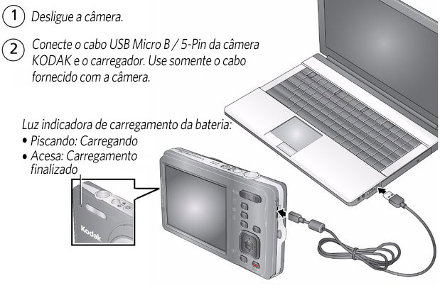 | IMPORTANTE: | Para a câmera ser carregada, o computador deve estar ligado e não pode estar no modo de hibernação. Desative os modos de hibernação, espera e suspensão. |