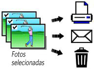 Uma marca de seleção é exibida na foto (Pressione OK novamente para remover a marca de seleção). Agora, você pode imprimir, transferir, excluir, etc. as fotos selecionadas. |