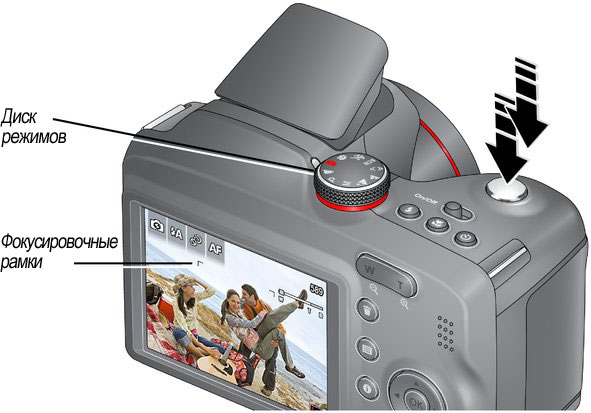 Для выполнения автофокусировки и установки параметров экспозиции слегка нажмите кнопку затвора. Изменение цвета фокусировочных рамок на зеленый означает завершение фокусировки. Если фотокамера не может сфокусироваться на нужном объекте, появляются красные фокусировочные рамки или "AF", отпустите кнопку затвора и перекомпонуйте кадр.