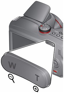 Чтобы приблизить объект съемки (сделать его изображение крупнее), нажмите кнопку T (Телеположение). Для увеличения угла зрения или уменьшения изображения объекта нажмите кнопку "W" (Широкоугольное положение).