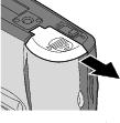 在相机底部,沿箭头方向将电池盖滑开,然后提起电池盖。