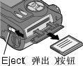 在相机底部,按照图示滑动 Eject(弹出)按钮,取出照片存储卡。