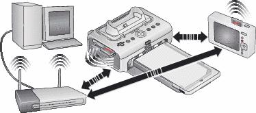 将柯达 Wi-Fi 卡(单独销售)插入存储卡插槽。然后,使用您的多功能底座打印机在现有的 Wi-Fi 无线(结构)网络上打印和传输照片,或利用 Wi-Fi 无线设备到设备 (Ad-Hoc) 网络直接将照片打印到多功能底座打印机。