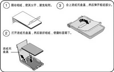 | 重要注意事项: | 不要装入超过 30 张相纸(参考托盘内侧上的纸张上限 )。 为避免留下指纹,请不要碰触相纸的光面(相纸)。 |