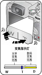 | 注: | 录像时不能使用数码变焦。 您会注意到使用数码变焦时影像品质降低了。 当照片质量达到获得 10 x 15 厘米(4 x 6 英寸)打印照片的极限时,变焦指示灯上的蓝色滚动条会暂停,然后呈红色显示。 |