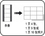 您可以从一段录像选择多张画面,在一张 10 x 15 厘米(4 x 6 英寸)的相纸上按照 1 页 4 张、1 页 9 张或 1 页 16 张的规格打印照片。
