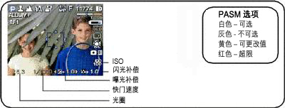 PASM 模式可控制光圈(f 值,也称为 f 档)、快门速度、曝光补偿、闪光补偿以及 ISO。 使用 Menu(菜单)按钮可以控制所有其它的设置。