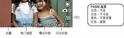 PASM 模式可控制光圈(f 值,也称为 f 档)、快门速度、曝光补偿、闪光补偿以及 ISO。 使用 Menu(菜单)按钮可以控制所有其它的设置。